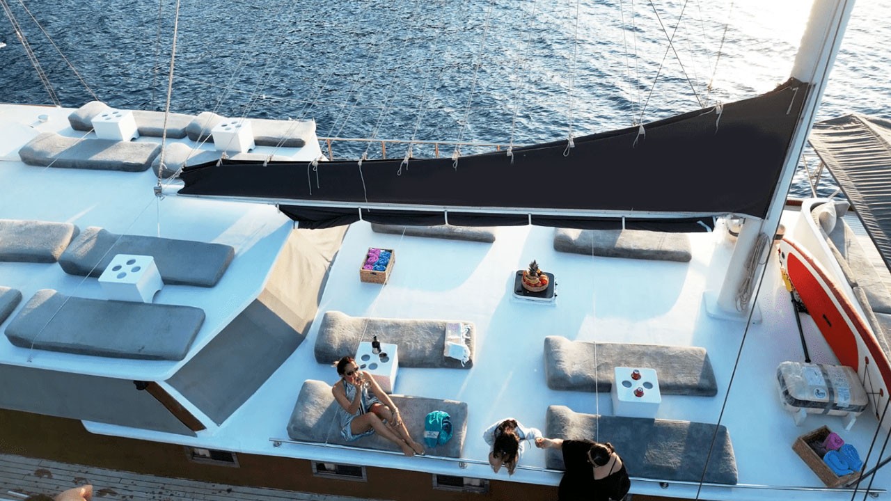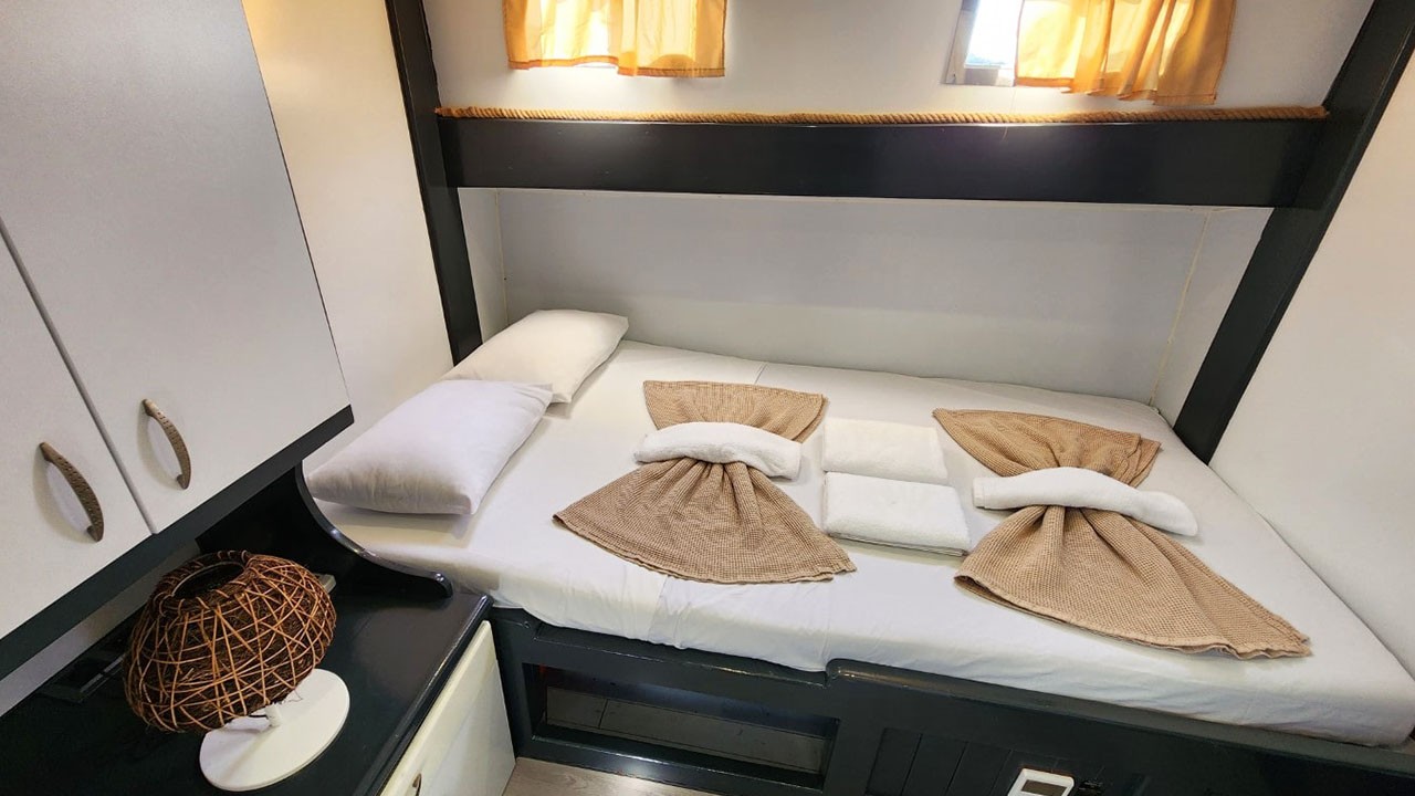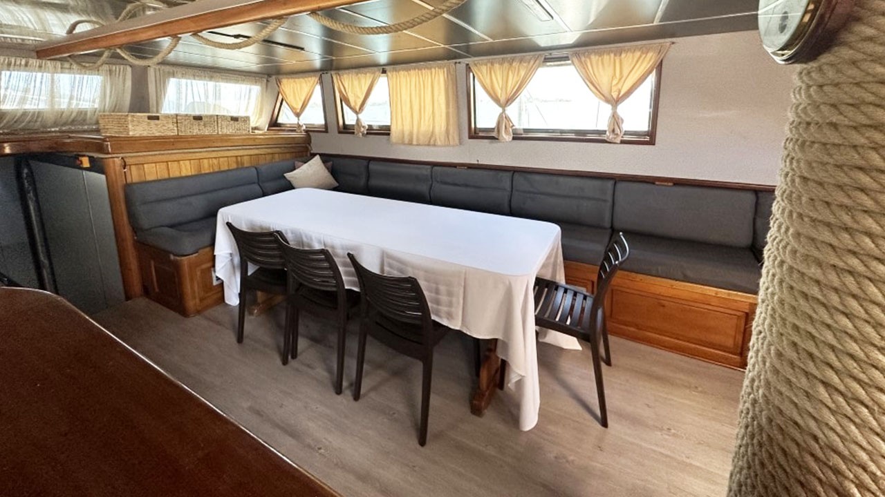На просторной палубе — мягкие зоны, маты для загара и кормовая столовая на открытом воздухе. Дополнительно — отдельная столовая зона; кухня полностью укомплектована. Развлечения: TV, DVD, музыкальная система, питание внутри/снаружи, интернет и др.