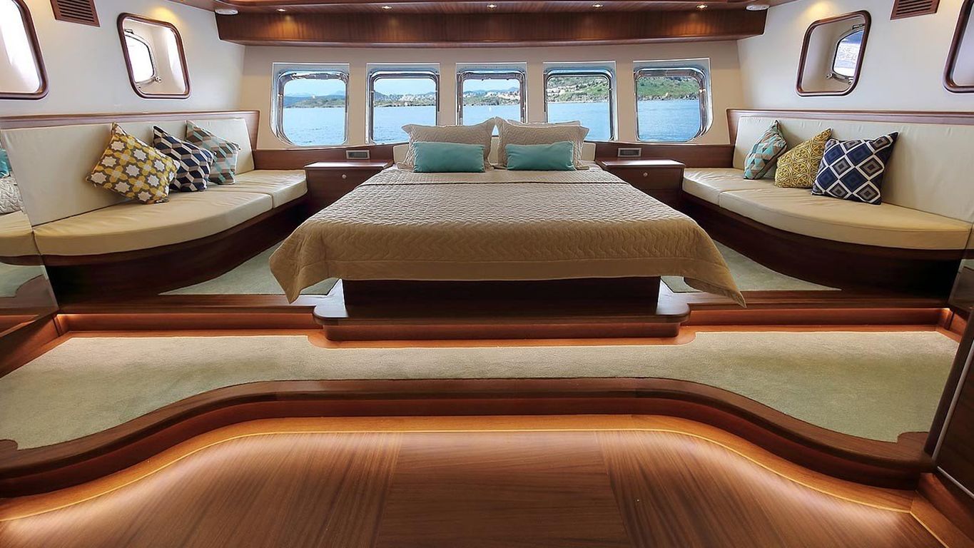 Вместимость до 10 гостей; 1 главная каюта, 2 двухместные каюты с двуспальными кроватями, 2 двухместные каюты с двумя односпальными кроватями, душевая кабина и туалеты во всех каютах, отдельные каюты для экипажа. |