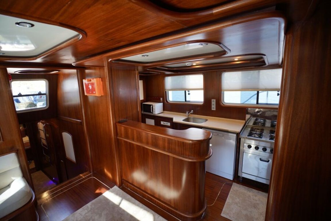 | Гулет Lavinia — современный 21-метровый гулет 2022 года постройки, предлагающий комфортную роскошь для частного «голубого круиза». Пять кают — две мастер и три дабл — на 10 гостей. Ширина 6,50 м даёт много места для удобных жилых зон и хорошо спроектированных кают. На палубе — теневые столовые зоны, лаунж-сиденья и мягкие солярии; в салоне — современный дизайн, обеденный стол, сидячая группа и полностью оснащённый камбуз. Для водного досуга: тузик 20 л.с., SUP-доски, каноэ, маски/трубки и рыболовное снаряжение — разнообразные активности для всех возрастов. Силовая установка: двигатель Baudouin 450 л.с. и два генератора по 18 кВА; крейсерская скорость 10 узлов. Кондиционер работает 4 часа в день; электросети 12V/24V/220V. Lavinia идеально подойдёт семьям и группам, ищущим современный гулет с комфортом, водными активностями и очарованием бирюзового турецкого побережья. |
