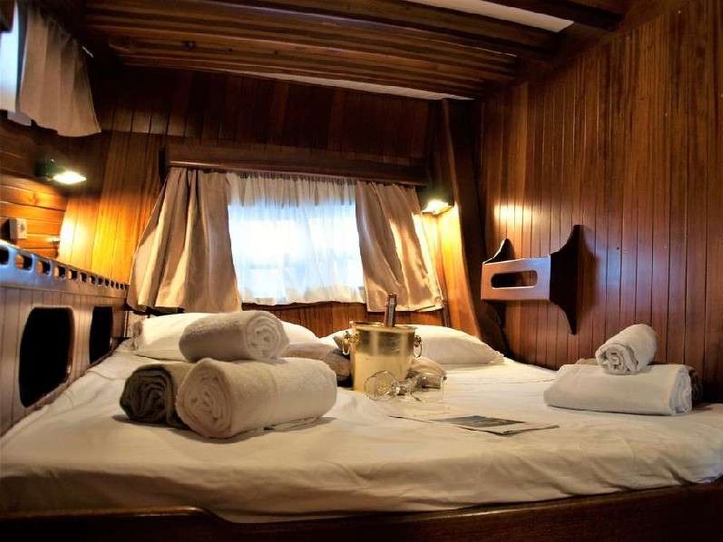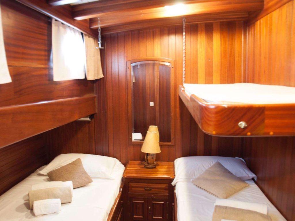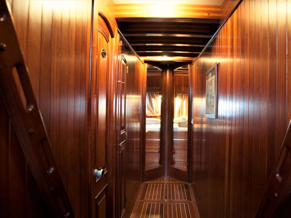 Вместимость до 12 гостей; 1 главная каюта, 2 двухместные каюты с двуспальными кроватями, 2 каюты с двумя односпальными кроватями, душевая кабина и туалеты во всех каютах, отдельные каюты для экипажа. |