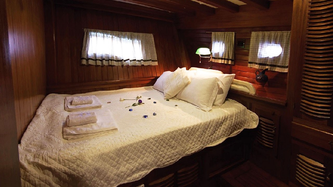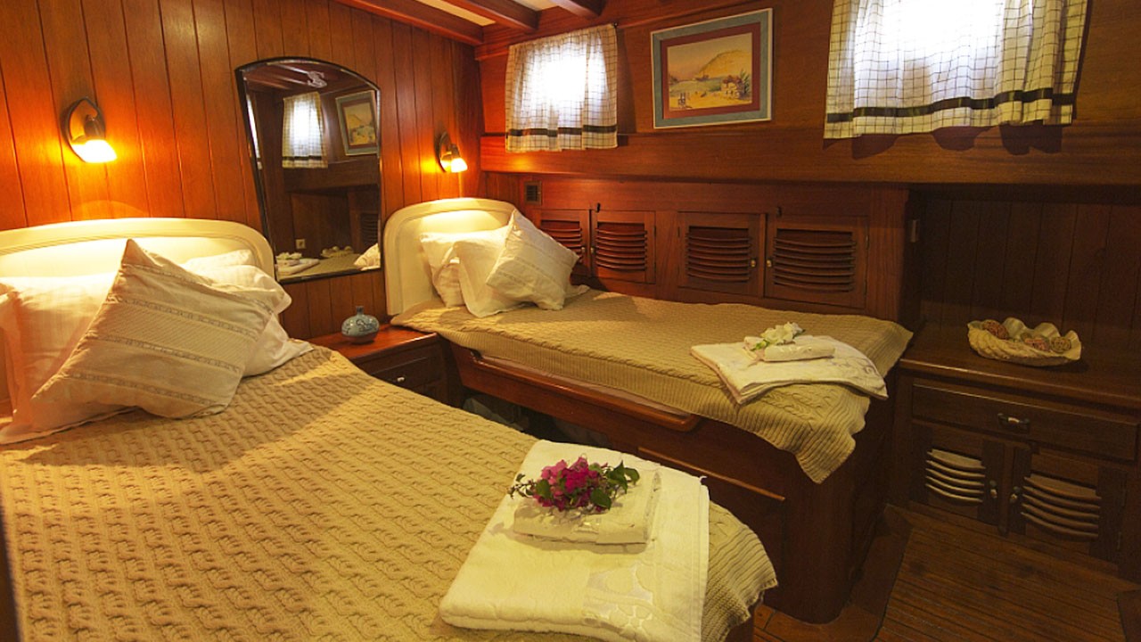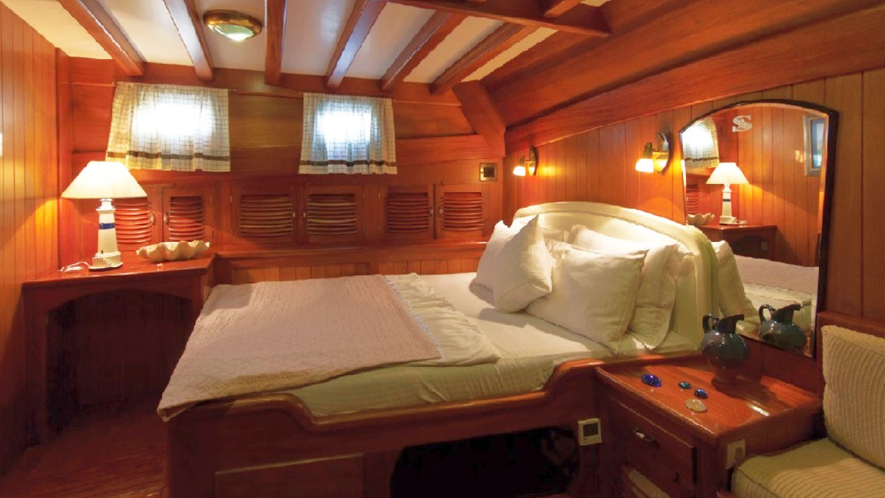 Вместимость до 12 гостей; 1 главная каюта, 2 двухместные каюты с двуспальными кроватями, 2 двухместные каюты с двумя односпальными кроватями, 1 трехместная каюта, душевая кабина и туалеты во всех каютах, отдельные каюты для экипажа. |