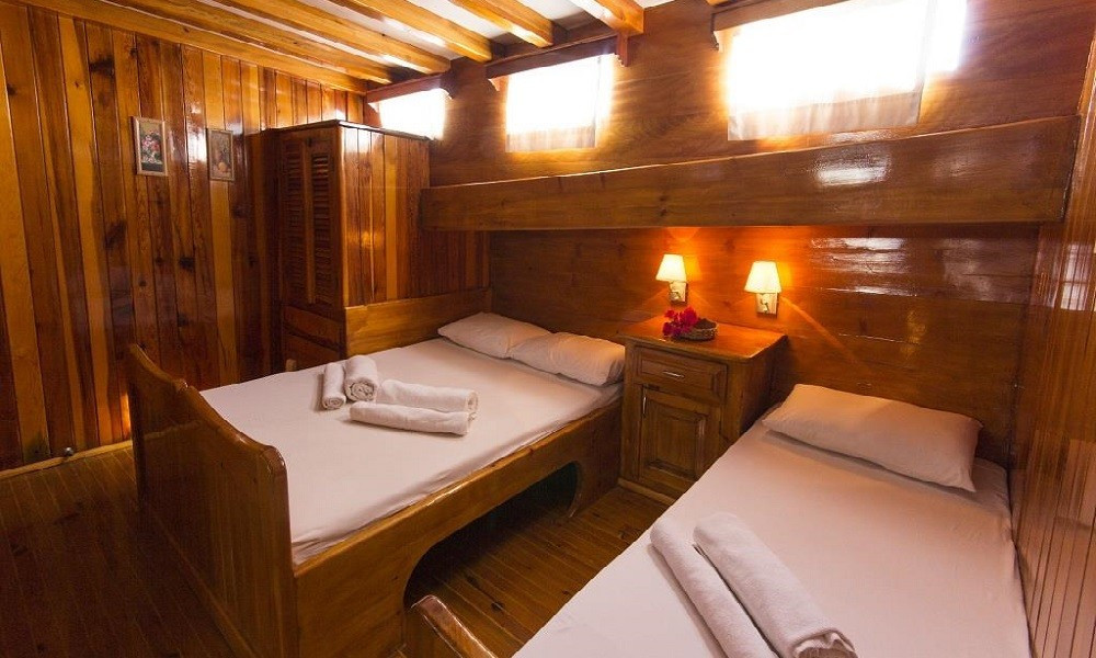 Вместимость до 18 гостей; 4 трехместные, 3 двухместные каюты, душевая кабина и туалеты во всех каютах, отдельные каюты для экипажа. |