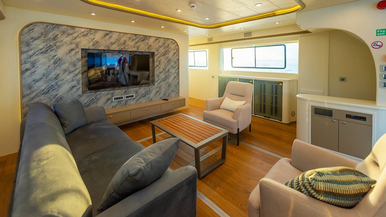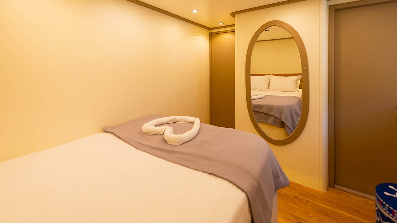 | 6 кают, включая: 2 каюты класса «мастер» с двуспальной кроватью и 4 двухместные каюты. Все каюты оборудованы собственной ванной комнатой, индивидуальным кондиционером с дистанционным управлением, спутниковым телевидением, музыкальной системой, унитазами с кнопочным смывом, фенами и огнетушителями. |
