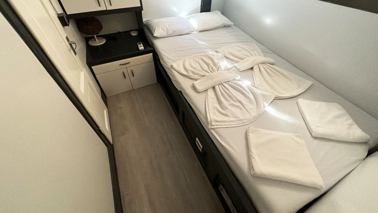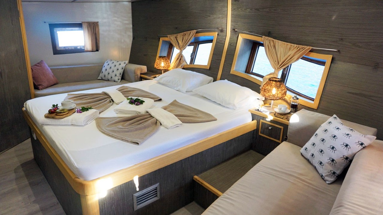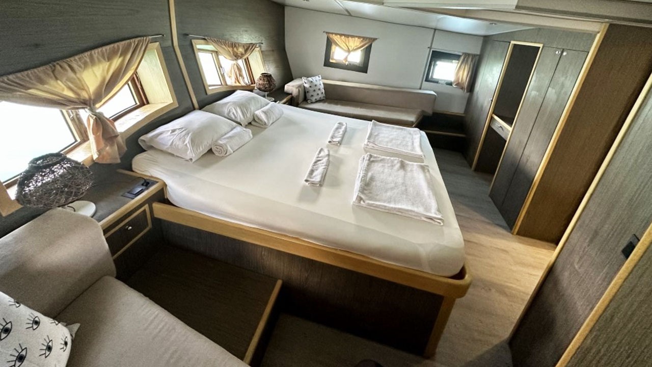 На просторной палубе — мягкие зоны, маты для загара и кормовая столовая на открытом воздухе. Дополнительно — отдельная столовая зона; кухня полностью укомплектована. Развлечения: TV, DVD, музыкальная система, питание внутри/снаружи, интернет и др.