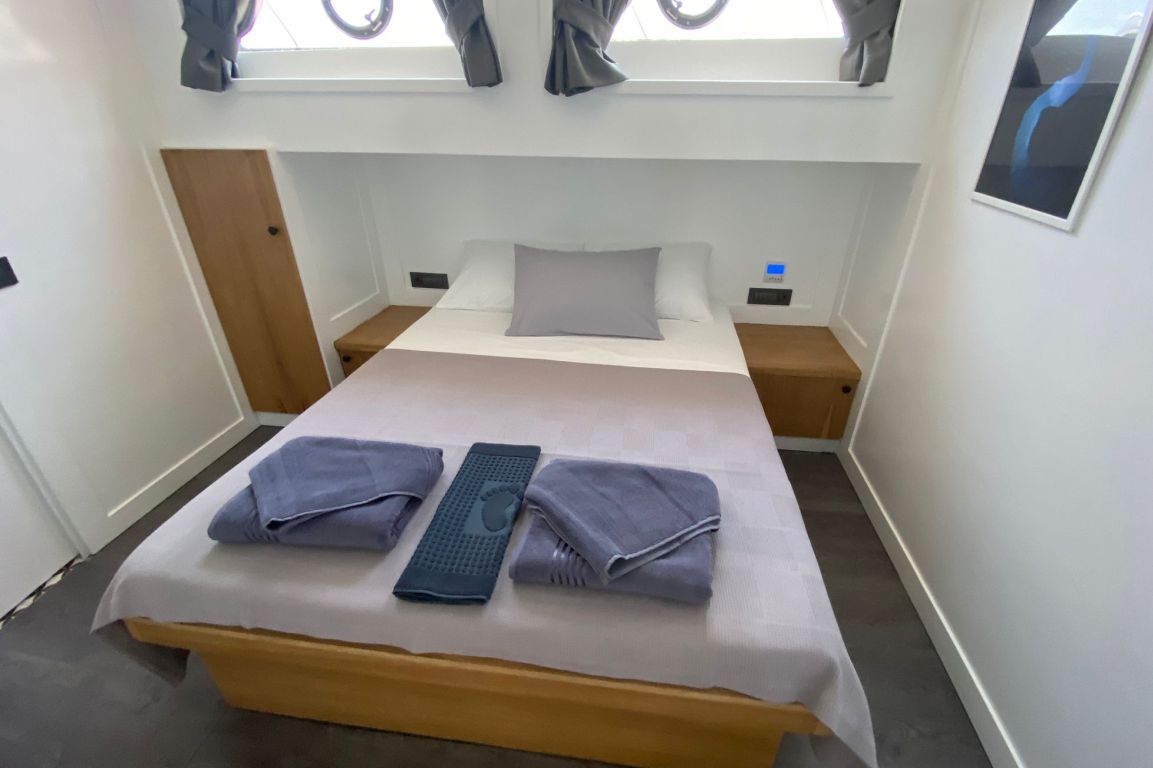 Вместимость до 10 гостей; 1 мастер-каюта, 4 двухместные каюты, кондиционер, шкаф для одежды, душевая кабина и туалеты домашнего типа во всех каютах, отдельные каюты для экипажа. |
