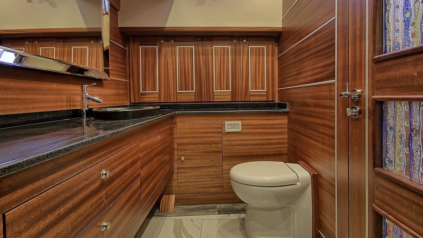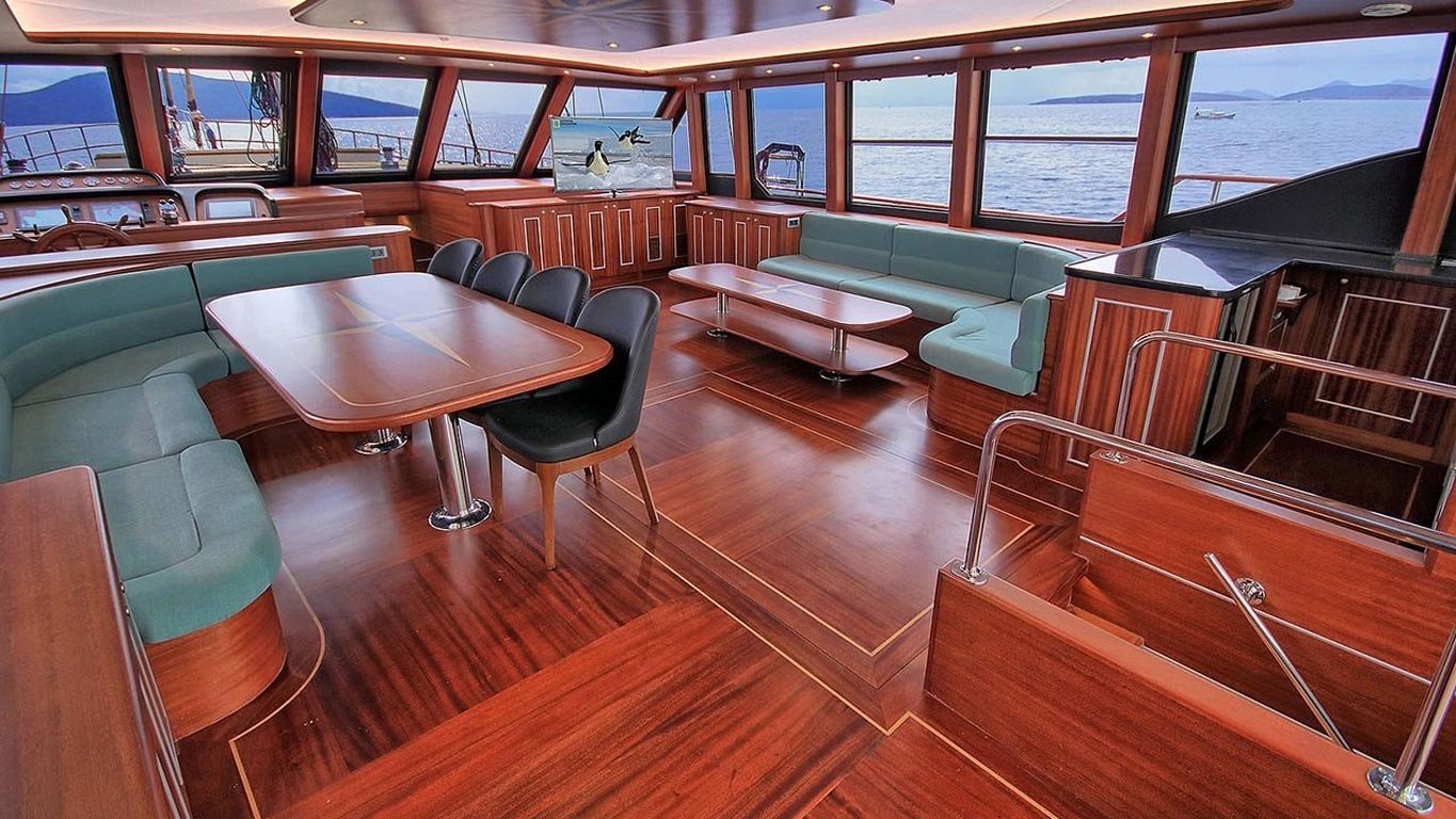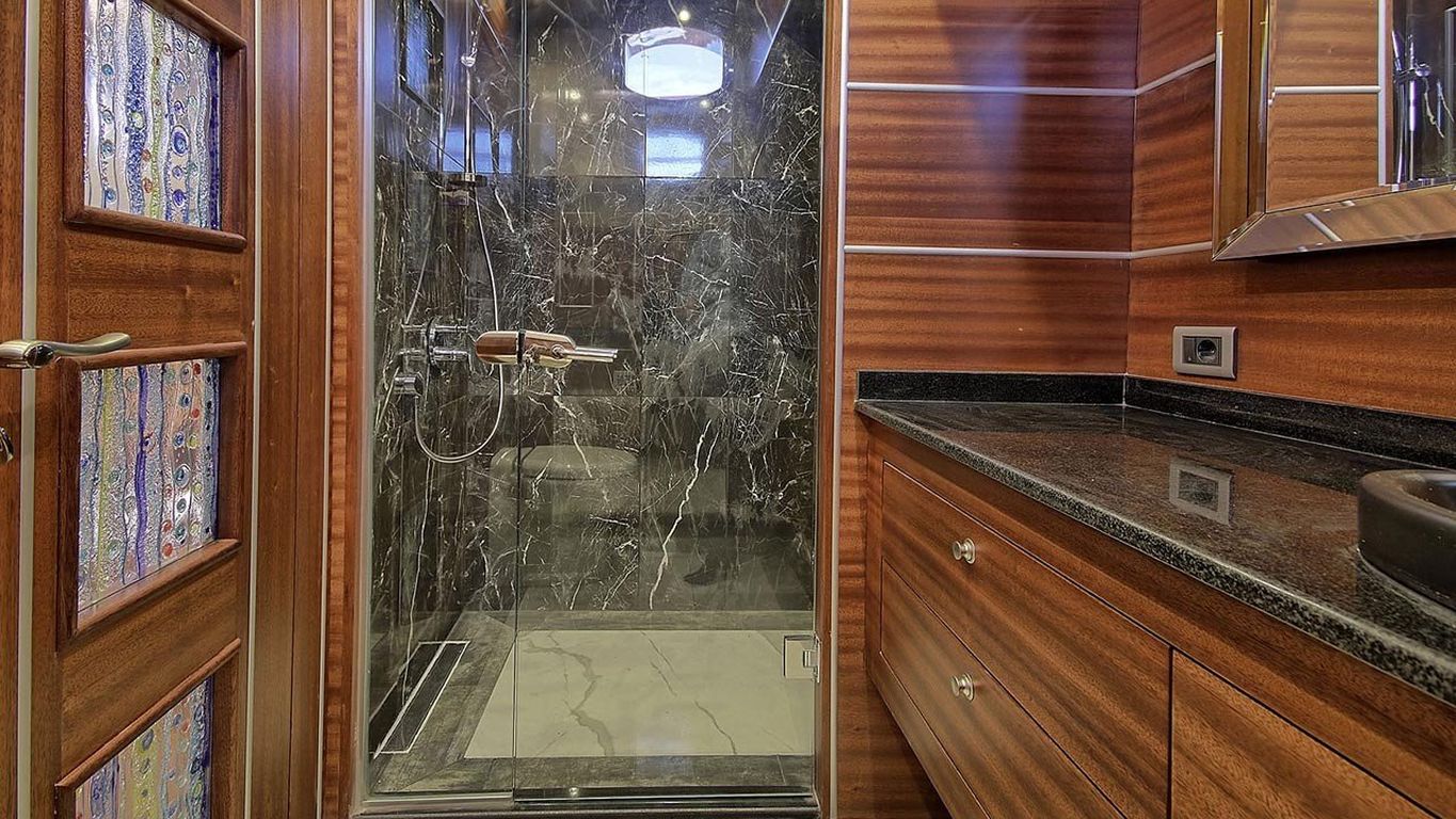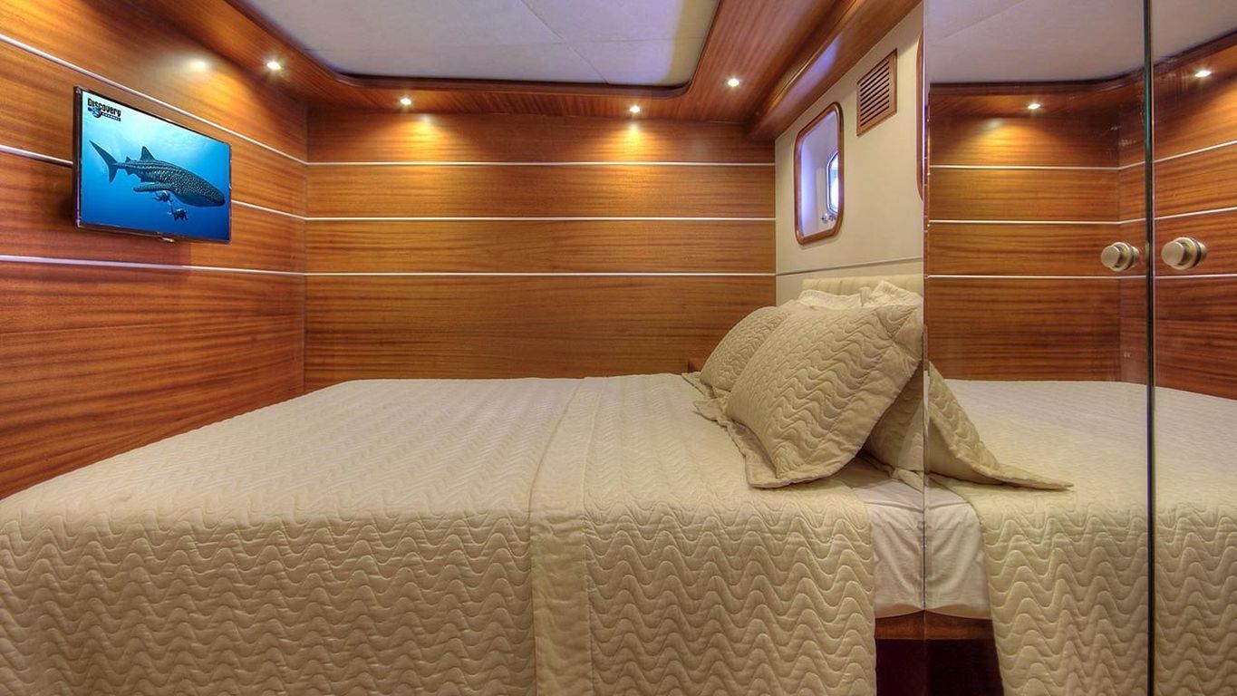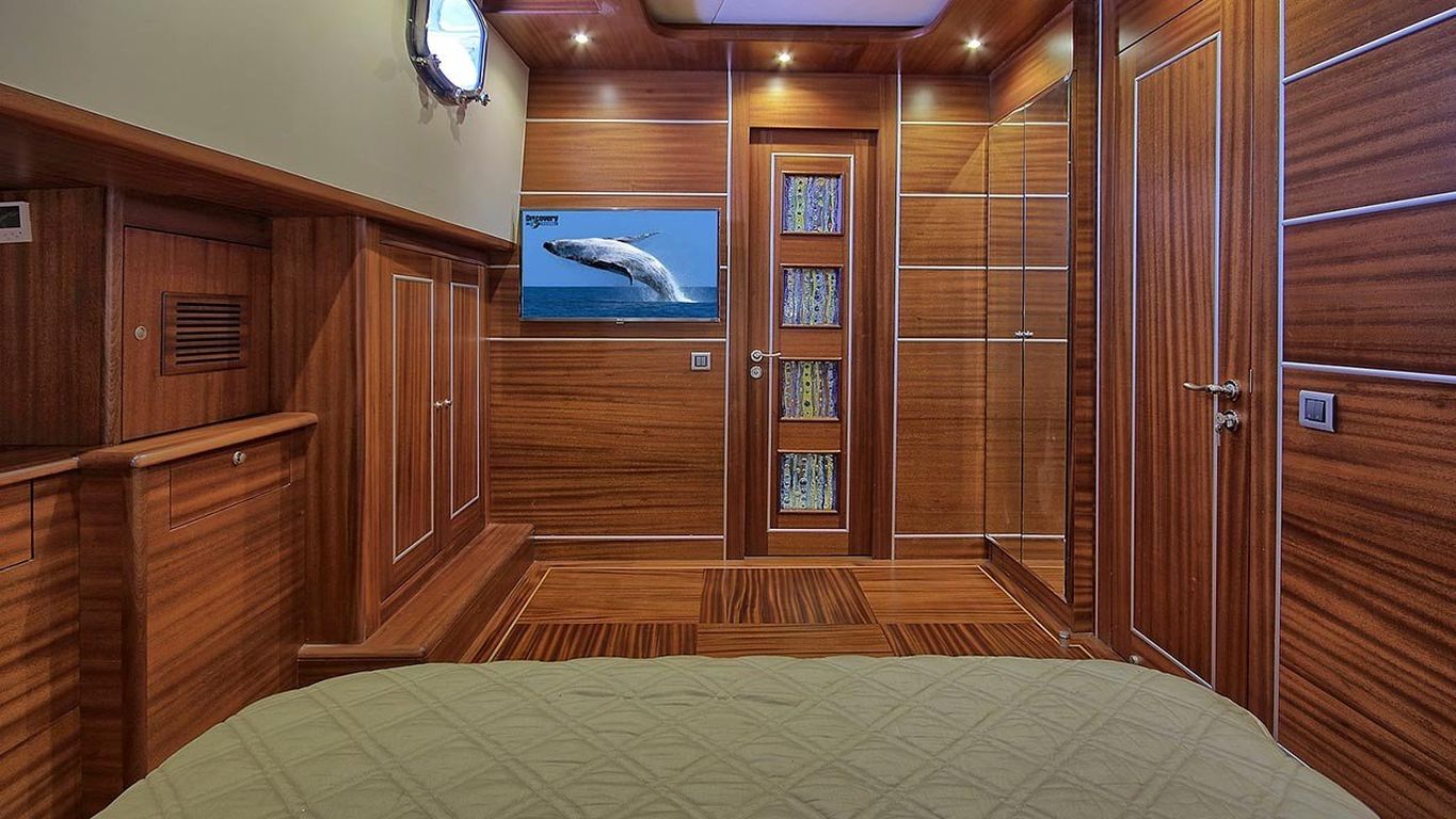 Вместимость до 10 гостей; 1 главная каюта, 2 двухместные каюты с двуспальными кроватями, 2 двухместные каюты с двумя односпальными кроватями, душевая кабина и туалеты во всех каютах, отдельные каюты для экипажа. |