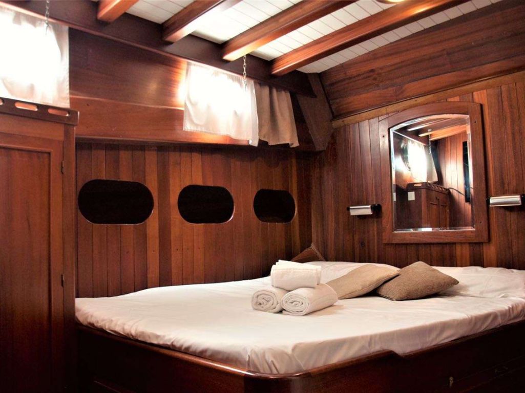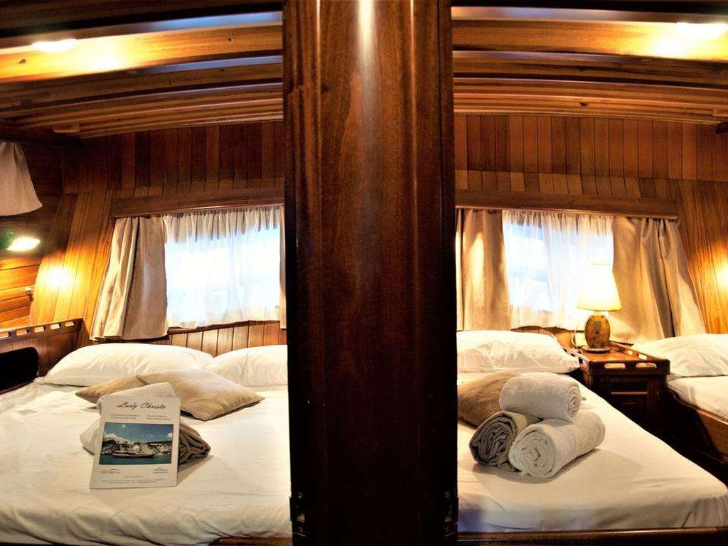 Вместимость до 12 гостей; 1 главная каюта, 2 двухместные каюты с двуспальными кроватями, 2 каюты с двумя односпальными кроватями, душевая кабина и туалеты во всех каютах, отдельные каюты для экипажа. |