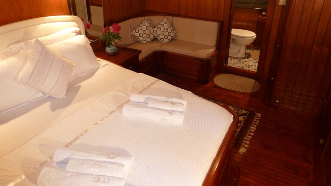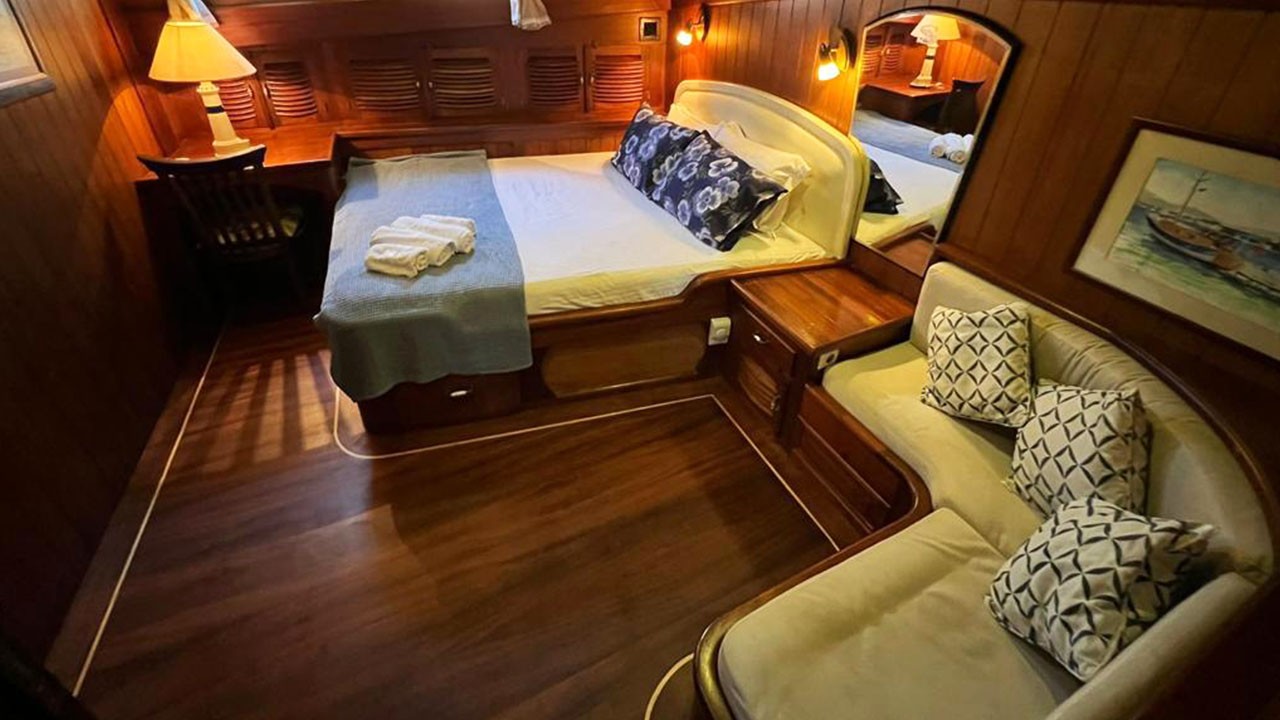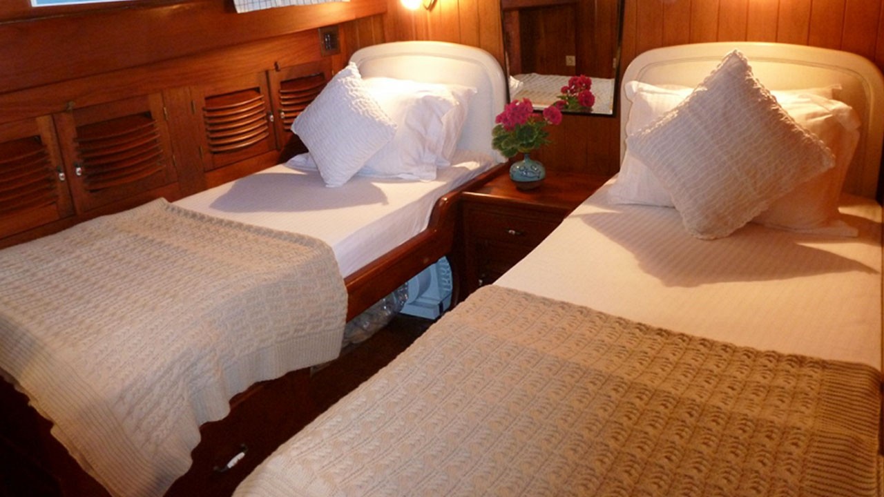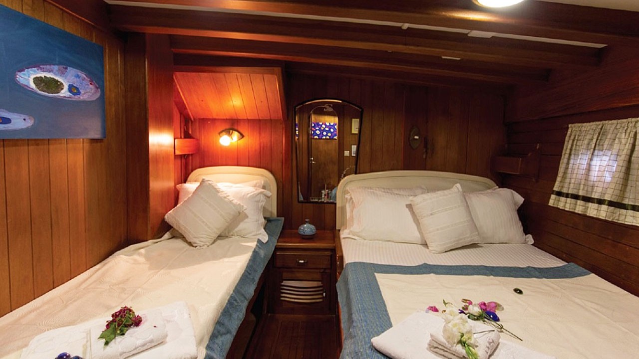 Вместимость до 12 гостей; 1 главная каюта, 2 двухместные каюты с двуспальными кроватями, 2 двухместные каюты с двумя односпальными кроватями, 1 трехместная каюта, душевая кабина и туалеты во всех каютах, отдельные каюты для экипажа. |