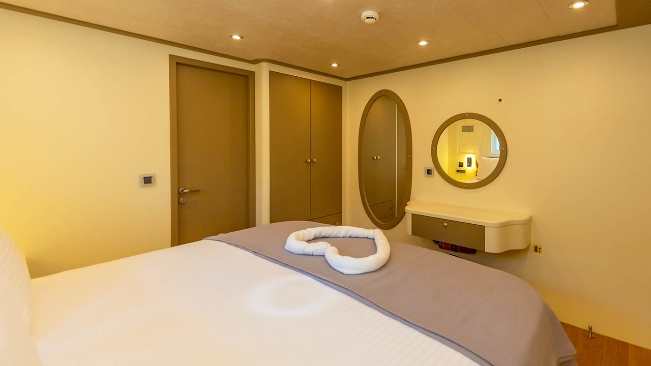 | 6 кают, включая: 2 каюты класса «мастер» с двуспальной кроватью и 4 двухместные каюты. Все каюты оборудованы собственной ванной комнатой, индивидуальным кондиционером с дистанционным управлением, спутниковым телевидением, музыкальной системой, унитазами с кнопочным смывом, фенами и огнетушителями. |